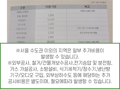 기준 평수 49.5㎡(15)를 기준하여 세부내역은 인테리어+에어컨+주방시설/기물+CCTV+의탁자+폴딩도어 등 총 비용 최소 3,000만원 ~ 7,000만원입니다. 매장 당 인테리어 조건 등이 달라질 수 있기에 인테리어 평당 비용으로 산출하지는 않습니다. 추가적으로 가맹비, 교육비, 상권에 따른 보증금, 권리금이 있습니다.